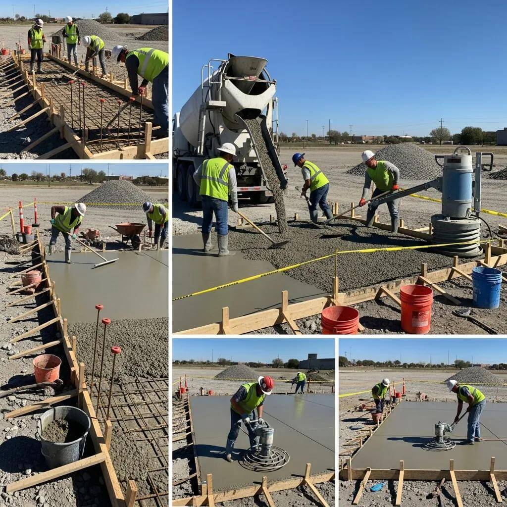 - Pouring Concrete Slab: Pouring the mixed concrete into the forms and spreading it evenly.